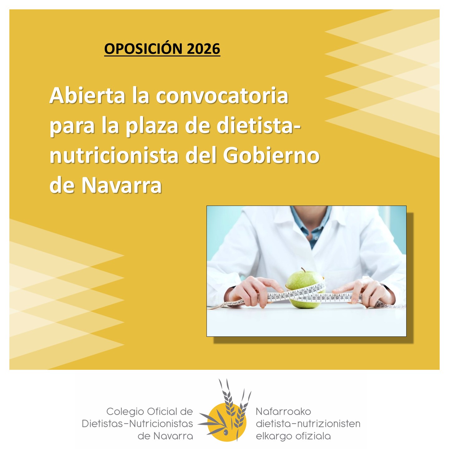 [vc_row content_width="grid" css=".vc_custom_1737368244781{border-right-width: 40px !important;border-left-width: 40px !important;}"][vc_column width="1/6"][/vc_column][vc_column width="2/3"][vc_single_image image="3951" img_size="400*400" alignment="center"][vc_empty_space][/vc_column][vc_column width="1/6"][/vc_column][/vc_row][vc_row content_width="grid" css=".vc_custom_1737368920523{border-right-width: 40px !important;border-left-width: 40px !important;}"][vc_column][vc_column_text] Abierta la convocatoria para la plaza de dietista-nutricionista del Gobierno de Navarra [/vc_column_text][vc_empty_space][/vc_column][/vc_row][vc_row content_width="grid" css=".vc_custom_1737368244781{border-right-width: 40px !important;border-left-width: 40px !important;}"][vc_column][vc_column_text]El Boletín Oficial de Navarra ha publicado este viernes 3...