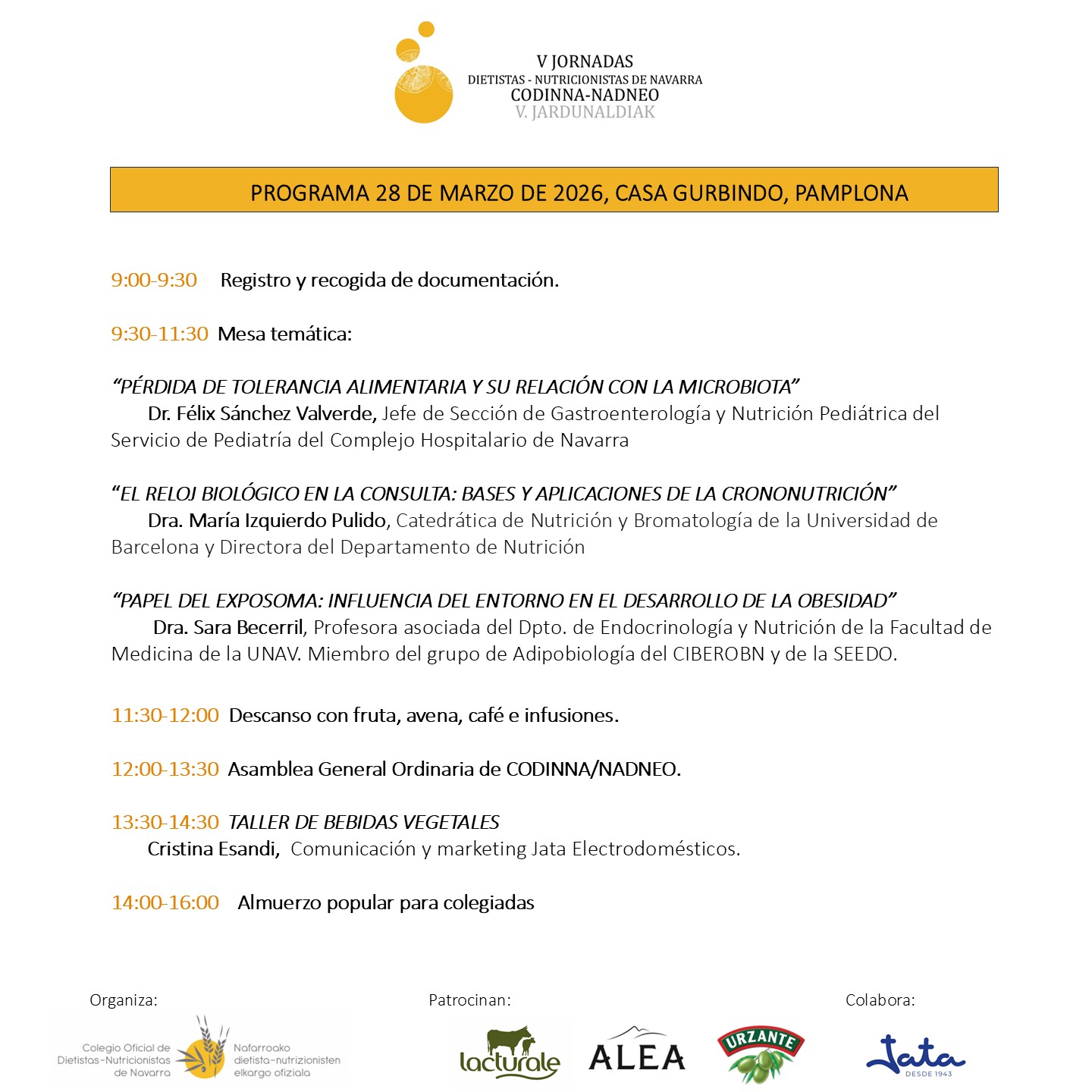 Un año más, se aprovechará el encuentro para celebrar la Asamblea General de CODINNA-NADNEO, y posteriormente tendrá lugar la comida popular de todas las colegiadas incluida en la inscripción.